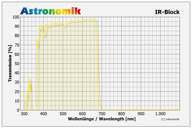 The Astronomik UV/IR filter is a must-have for users of digital cameras with acromatic refractors. UV/IR rays unfocussed by the lenses cause a disturbing "halo" on the ccd chip, which can be completely eliminated by using this filter. The very high quality of the device is guaranteed by the 98% light transmission index, the high quality optical glass, which is highly resistant to scratches thanks to its hard coating. It can of course be combined with other filters and its surfaces are anti-reflective coated for impeccable imaging.