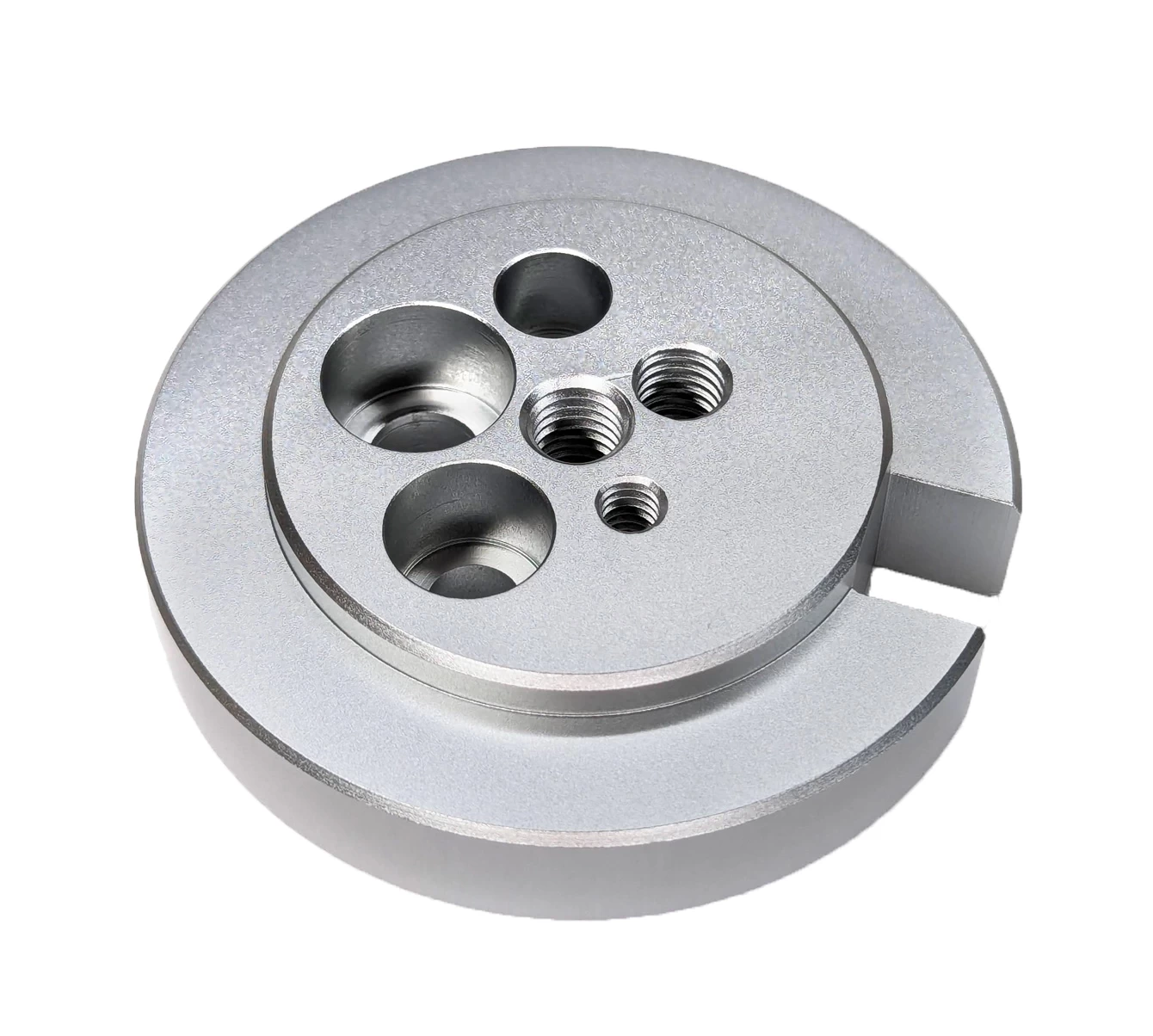 Fitted with three threaded holes (3/8", 1/4" and M10) and three countersunk holes (M6, M8, M10, 1/4" and 3/8"). Made of aluminium, height 2 cm, weight approx.: 1kg.