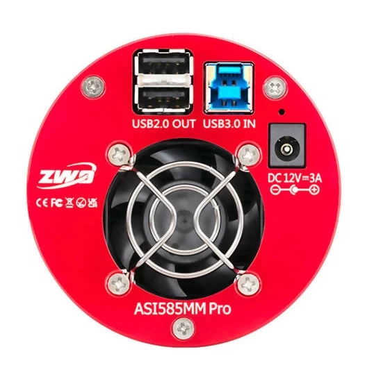 The ZWO ASI 585 MM-PRO monochrome cooled camera has 2 USB 2.0 and 1 USB 3.0 ports. The camera is cooled by a 12V supply voltage, for which the manufacturer recommends a minimum of 3A.