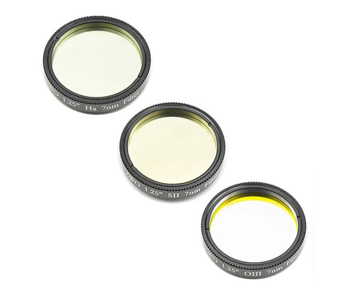 All three filters have a maximum light transmission capability of over 80%. The peak wavelength for the H-Alpha filter is 656 nm, the O-III filter peaks at 500 nm, and the S-II filter falls within the 672 nm range, primarily aiding in the photographic capture of nebulae, supernova remnants, etc., that emit in these radiation ranges.