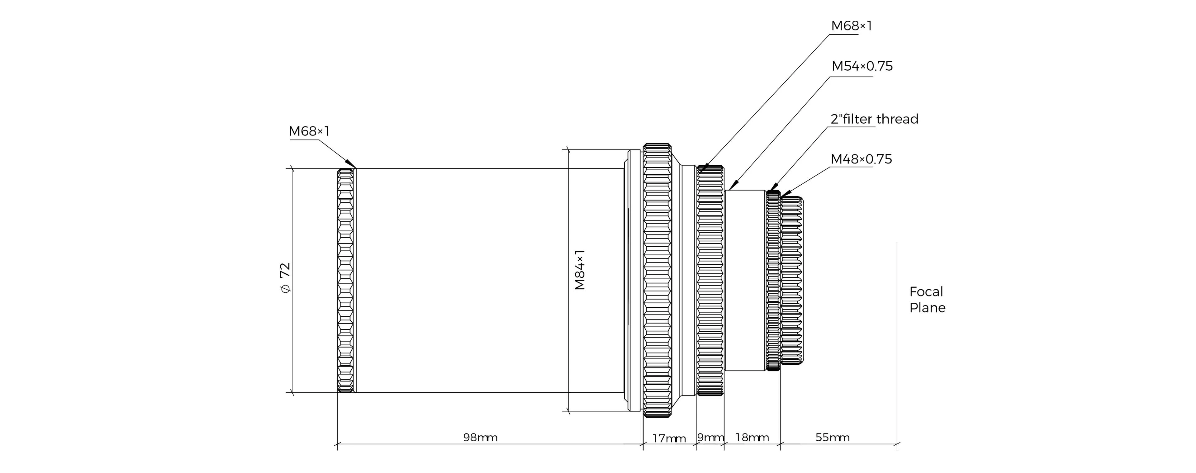 A reduktor 44 mm képátlóval rendelkezik, amely full-frame kamerák használatához is teljesen megfelelő. A kamera oldalon M48, M54 és M68 meneteket találunk, amelyek lehetővé teszi a széles körű kompatibilitást a különböző rendszerekkel. M48 csatlakozás során a klasszikus 55 mm szenzortávolságot kapjuk, mely 73 mm-re növekszik M54 menet használatakor, míg 82 mm-re M68 menet esetén.
