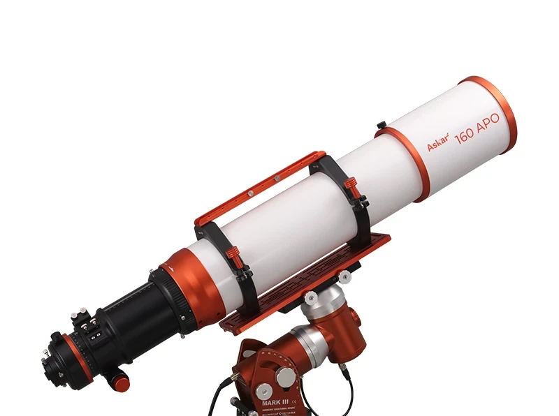 A tubus kialakítása különösen figyelemre méltó a két keresőtávcső papucs és a multifunkciós fogantyú révén, amelyek kényelmes és biztonságos használatot tesznek lehetővé. A megerősített tubusgyűrűk extra stabilitást biztosítanak, ami elengedhetetlen a hosszabb megfigyelések során. Az Askar 160APO-hoz opcionálisan 0.8x reduktor is elérhető, mellyel akár f/5.6 fényerejű rendszert kapunk fotózás során.