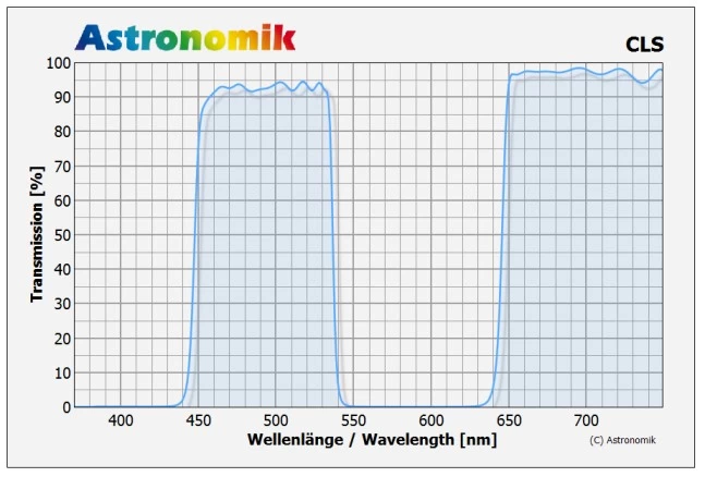 Az Astronomik CLS szűrő működési elve meglehetősen egyszerű: a bejövő fényből csak bizonyos hullámhosszakat enged át, megakadályozva a zavaró mesterséges fényforrások (pl. nátrium- és higanygőz lámpák) fényét. Ennek eredménye, hogy az égi háttér és a megfigyelt objektum közötti kontraszt megnő, így a halvány részletek is megfigyelhetővé válnak. Valamennyi Astronomik mély-ég szűrőt maximális odafigyeléssel és precizitással készít a gyártó, így a kontraszt és fényáteresztés a lehető legjobb. A rendkívül pontosan polírozott üveganyag és a mintegy 130 rétegben felgőzölt interferencia réteg ezeket a szűrőket egyértelműen a versenytársai fölé emeli. További előnyös tulajdonságuk a rendkívüli karcállóság, ezért még hosszú évek intenzív használata után is megőrzik transzmissziós karakterisztikájukat. A prémium minőségű alapanyagoknak és megmunkálásnak köszönhetően az Astronomik szűrők egyáltalán nem rontanak a látott képen. Az olcsóbb szűrőkkel ellentétben az Astronomik szűrőkben a csillagok teljesen pontszerűek maradnak.