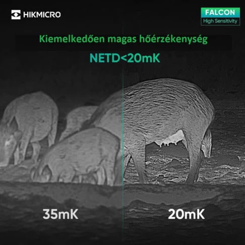 A Hikmicro Falcon FQ50 hőkamera lelke a profi 640 x 512 felbontású 12μm érzékelő, amely különösen érzékeny (NETD < 20 mK), ezáltal még rossz időjárási feltételek mellett is részletgazdag képet ad. Ember alak detektálására akár 2600 méterről is képes, de nagyobb hőforrások, akár ennél távolabbról is észlelhetőek. Legközelebbi objektum amit a készülékkel láthatunk 5 méterre lehet. A kiváló érzékenységet a F:1.0 fényerejű objektív támogatja 2.6x-es nagyításával, amelyet digitálisan 20.8x-ig növelhetünk több lépésben.
