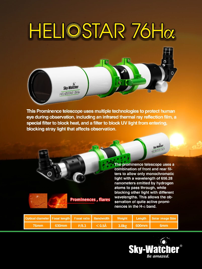 A SkyWatcher Heliostar 76/630 H-alpha naptávcső az első olyan eszköz a neves gyártó palettáján, melyet kifejezetten amatőrcsillagászok számára alkottak meg a Nap hidrogén-alfa hullámhossztartományában látható jelenségeinek megfigyelésére. Megpillanthatjuk központi csillagunk peremén a protuberanciákat (napkitörések), illetve a látható fény tartományában észlelhetetlen felületi képződményeket (flerek).