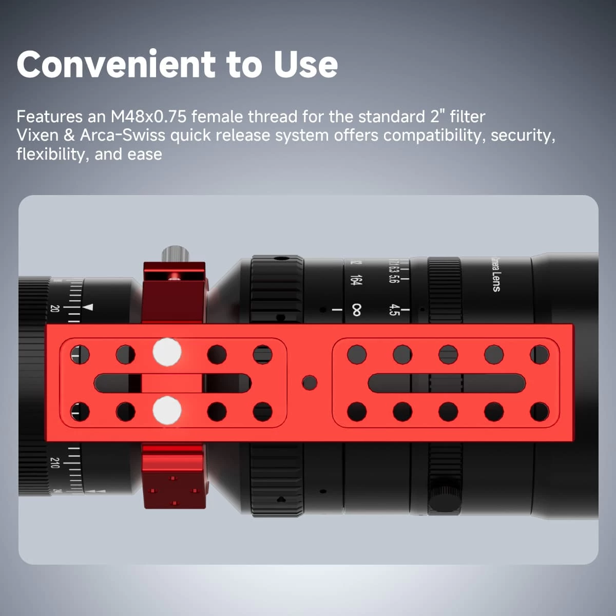 Jellemzően nappali használatkor az objektív elejére 72 mm-es szűrők helyezhetőek. Az asztrofotós célra a 2"-os (M48) szűrőket a kihuzat végén tudjuk elhelyezni, de természetesen opcionálisan használhatunk szűrőtartó fiókot vagy szűrőváltót is.